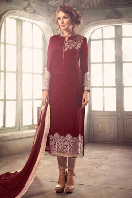 Beige Georgette Embroidered Straight Cut Suit Glamour