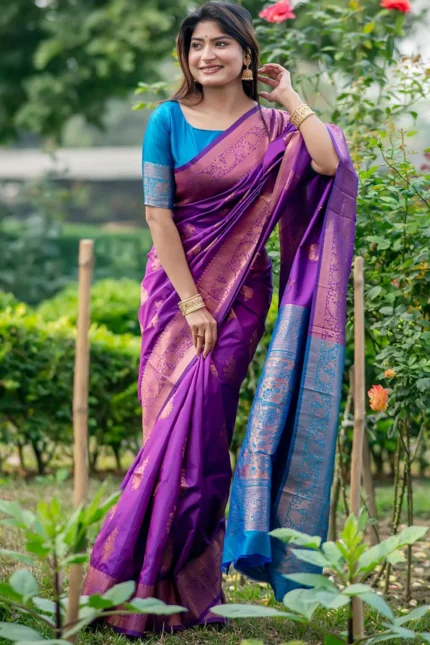 - The magenta Kalyani silk zari woven saree is a sophisticated and elegant traditional ensemble that radiates richness and cultural heritage. Crafted from fine Kalyani silk, this saree features a deep brown hue that exudes a sense of timeless grace and refinement. The fabric is known for its soft texture, lightweight feel, and luxurious drape, making it an ideal choice for festive and auspicious occasions.