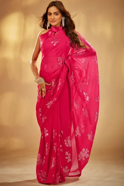 Dark Blue Faux Georgette Sequins Sari Party Wear