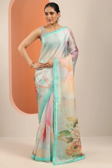 Off White Satin Blend Embroidered Saree Party Wear