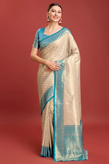 Kanchipuram Silk Zari Woven Traditional Saree With Contrast Sky Blue Blouse Festive Wear