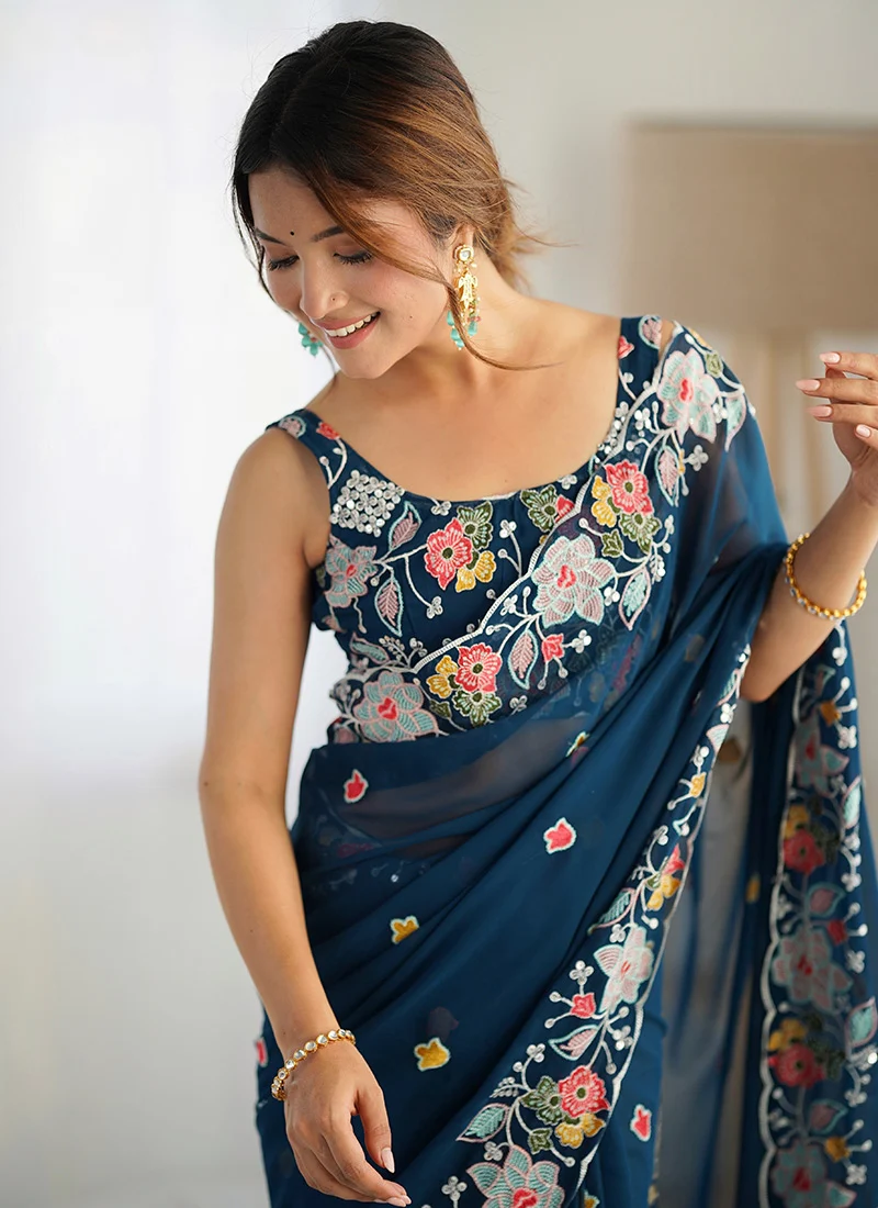 Teal Georgette Embroidered Sequins Saree After Six Wear