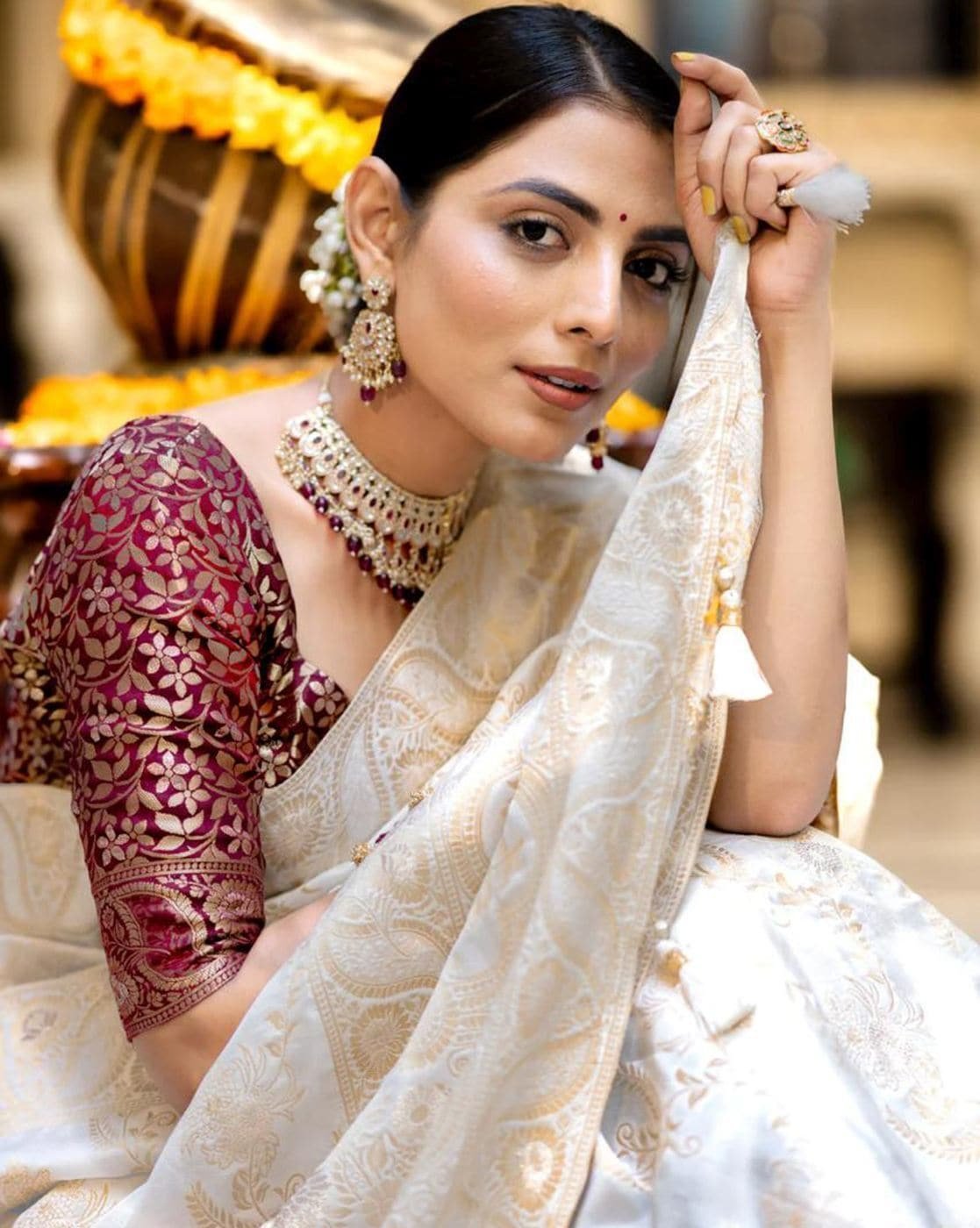 The Banarasi Silk Zari Woven Jacquard Saree is a graceful and timeless ensemble that exudes tradition and elegance. Crafted from luxurious Banarasi silk this saree showcases intricate Zari weaving in traditional jacquard patterns adding an air of regal sophistication. The rich grey hue of the saree is complemented by the shimmer of gold and silver Zari accents making it a perfect choice for festive occasions and cultural celebrations.