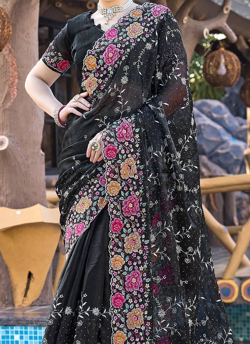 The Black Organza Floral Thread EmbroideBlack Sequins Stone Embossed Saree is a luxurious blend of timeless elegance and contemporary style designed to make a statement at any festive or special occasion. This saree is meticulously crafted from premium fabric showcasing a rich Black hue that exudes vibrancy and celebration. The intricate floral thread embroidery along the border adds a touch of traditional artistry while the sequins and stone embossing bring in a modern dazzling effect that catches the light with every movement ensuring you stand out in a crowd.
