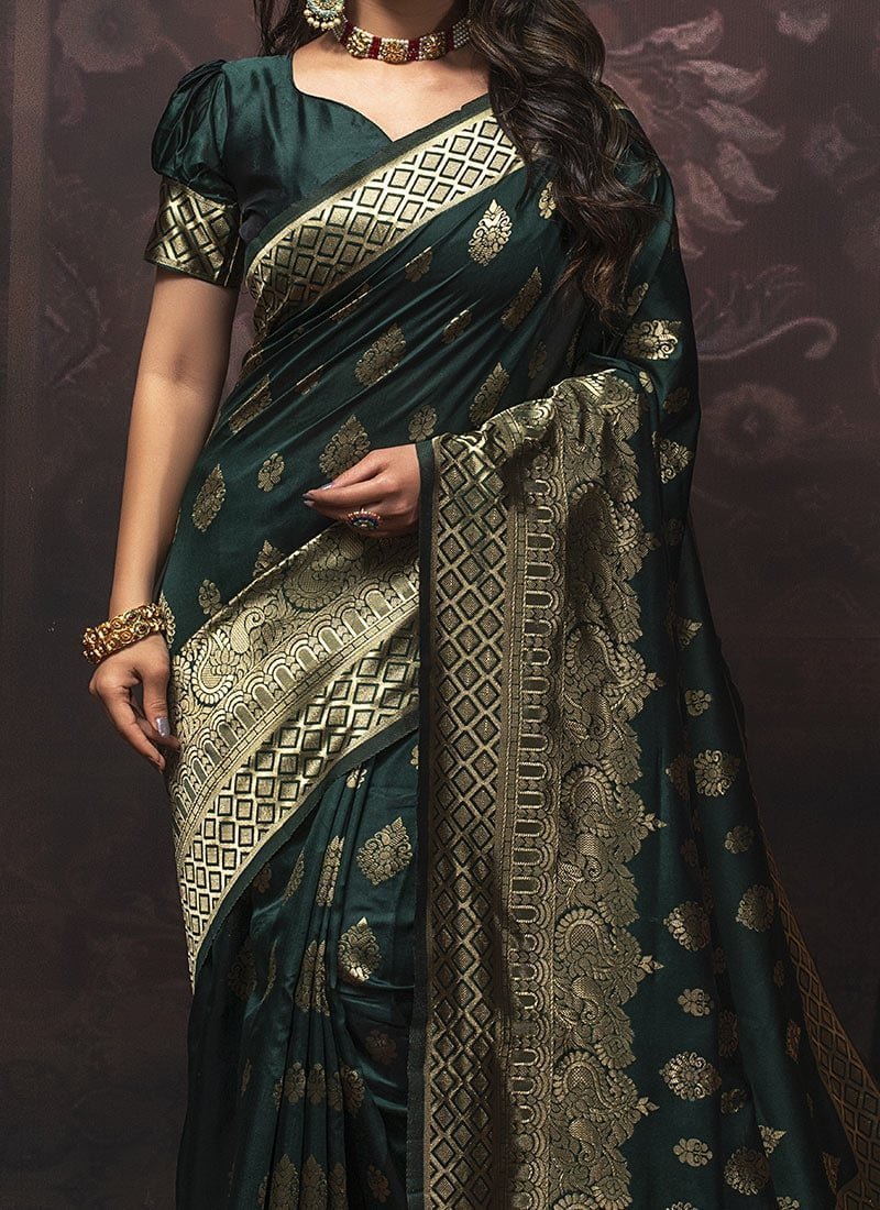 Fashion and pattern would be at the peak in this green Benarasi silk saree. The ethnic jacquard work over the saree with different temple motifs looks chic and ideal. This saree comes with a green Benarasi silk blouse. This saree is perfect for a festival.